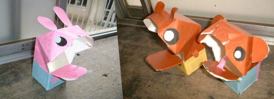 | 部品をつける | せっかくの紙パックという[リサイクル工作]なので,[耳]や[手],[足],[たてがみ]などの部品も紙パックを使いたいです。色画用紙もホッチキスでとめてもいいし,くっつきにくいですが木工用ボンドでも。 |
