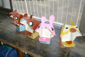 ※’99年度,学校の「作って遊ぼう集会」で,企画したモノです。4年生が2年生に教えながら作って,いっしょに遊びました。 学校が変わって’00年度には、「子ども祭り」で、3年生が全校の子ども達や大人に教えました。「くっぱにんぎょう」(パックをさかさまにしたらしい。どこかのゲームにもあったらしいが?)の正式名称もこのときつけられました。 ※写真は、’00年度の子どもの作品です。 |